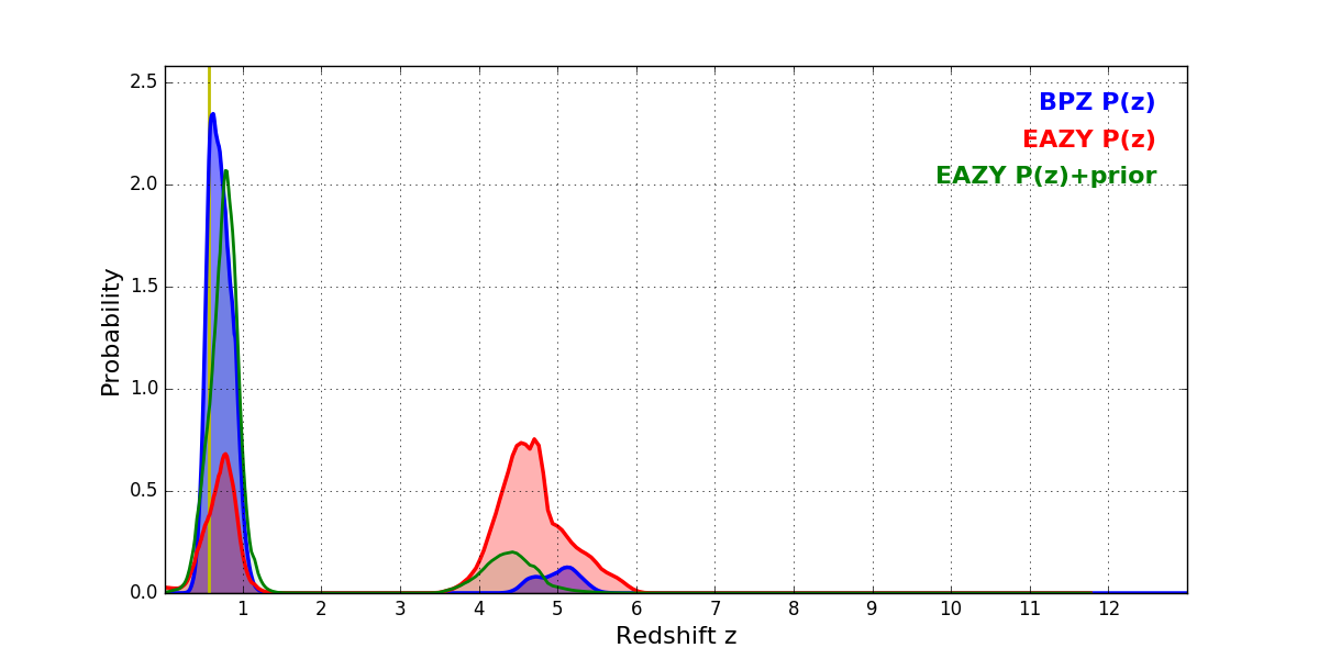 In P(z) plots: Yellow lines mark the cluster redshift z = 0.566,