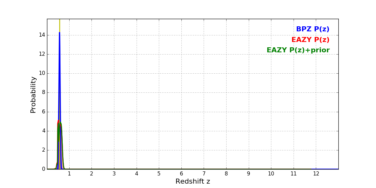 In P(z) plots: Yellow lines mark the cluster redshift z = 0.566,