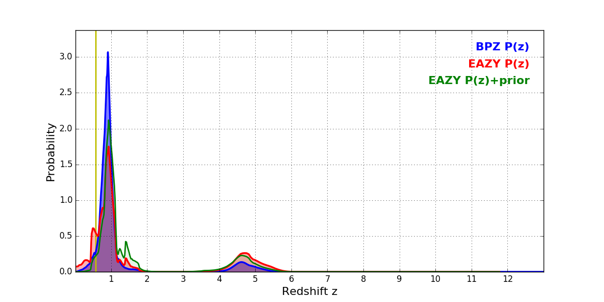 In P(z) plots: Yellow lines mark the cluster redshift z = 0.566,