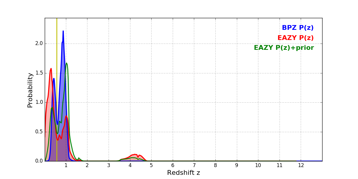 In P(z) plots: Yellow lines mark the cluster redshift z = 0.566,