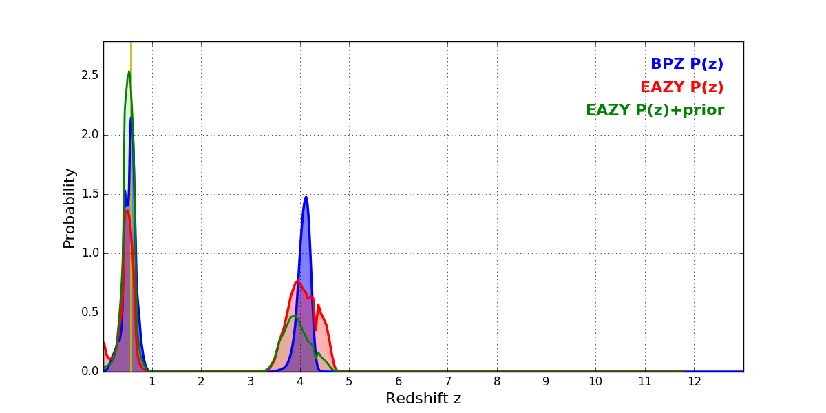In P(z) plots: Yellow lines mark the cluster redshift z = 0.566,