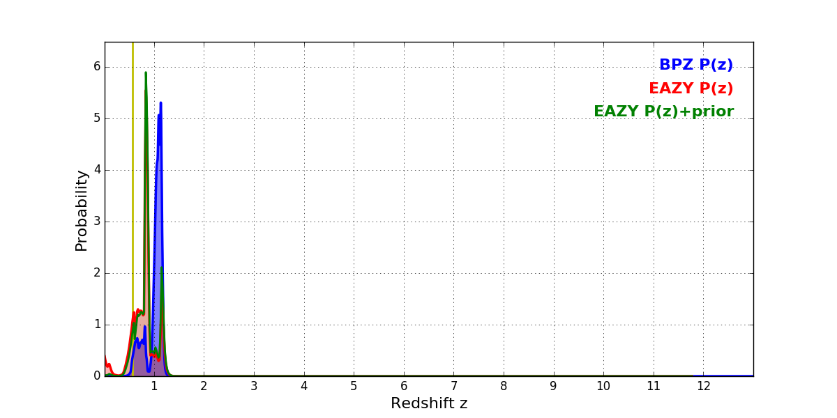 In P(z) plots: Yellow lines mark the cluster redshift z = 0.566,