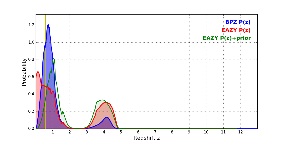 In P(z) plots: Yellow lines mark the cluster redshift z = 0.566,