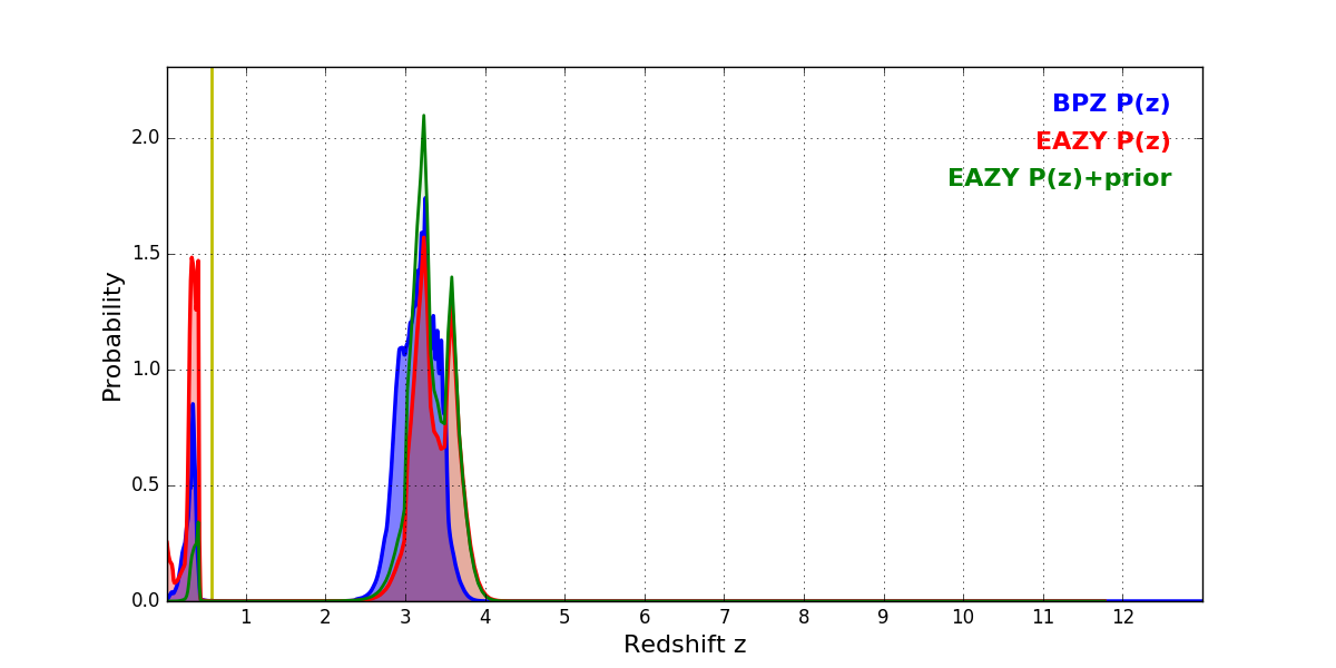 In P(z) plots: Yellow lines mark the cluster redshift z = 0.566,
