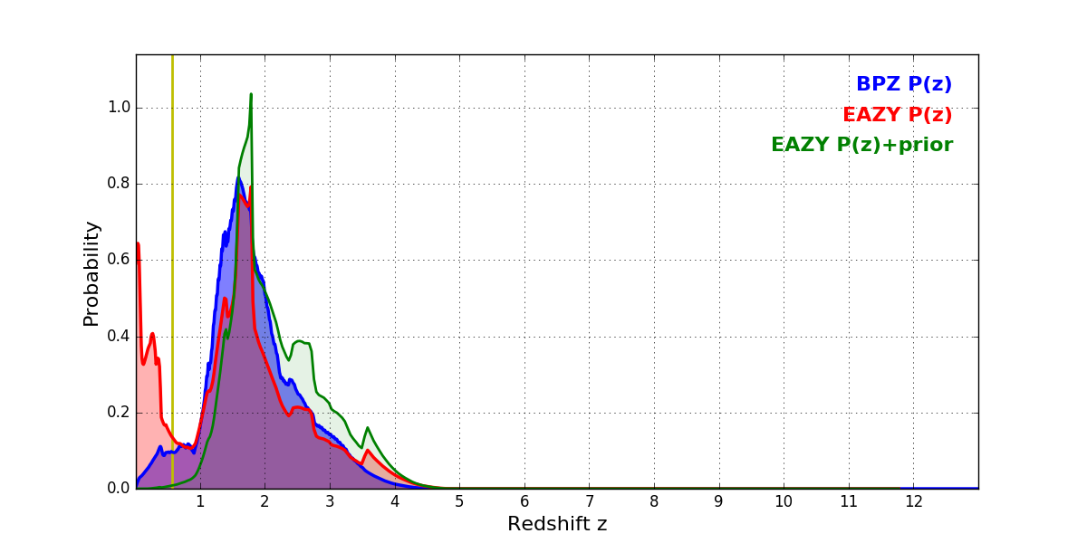 In P(z) plots: Yellow lines mark the cluster redshift z = 0.566,