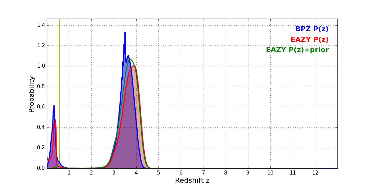In P(z) plots: Yellow lines mark the cluster redshift z = 0.566,