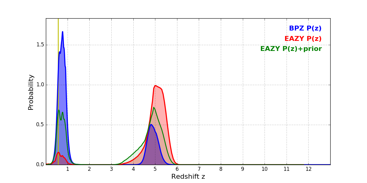 In P(z) plots: Yellow lines mark the cluster redshift z = 0.566,