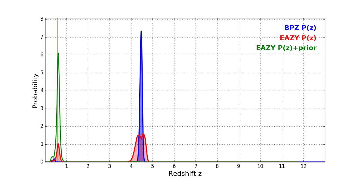 In P(z) plots: Yellow lines mark the cluster redshift z = 0.566,