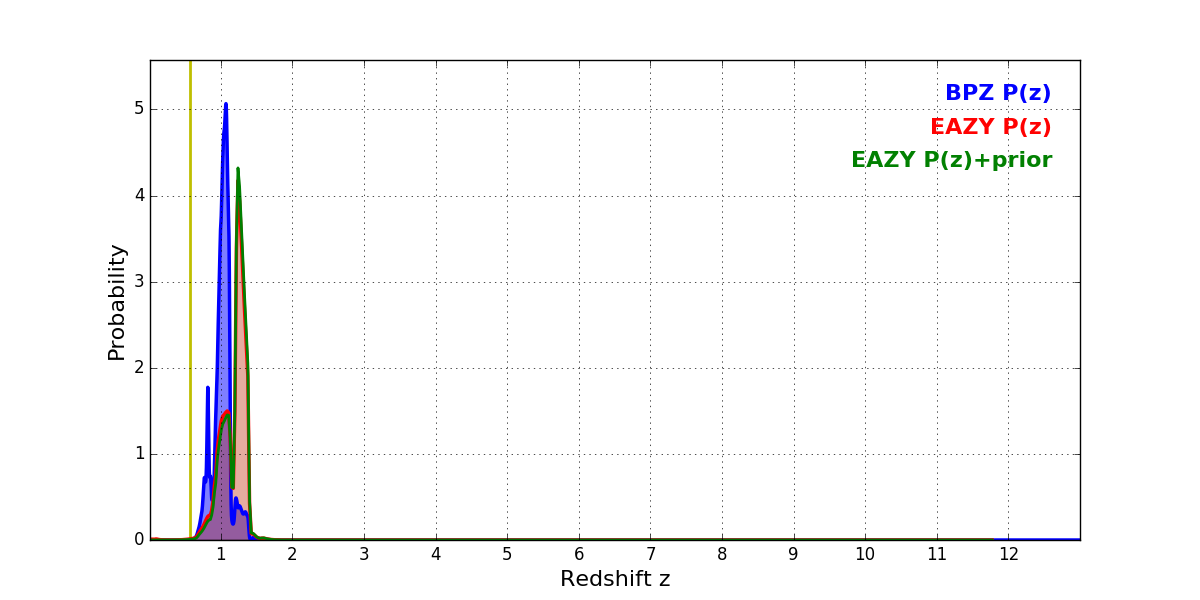 In P(z) plots: Yellow lines mark the cluster redshift z = 0.566,