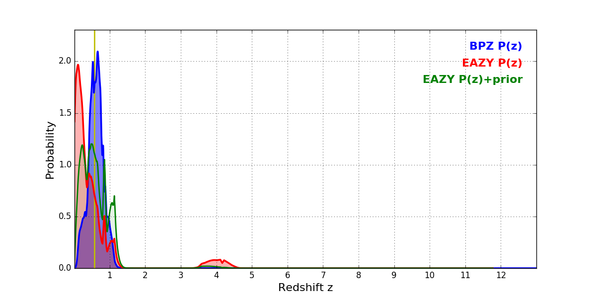 In P(z) plots: Yellow lines mark the cluster redshift z = 0.566,