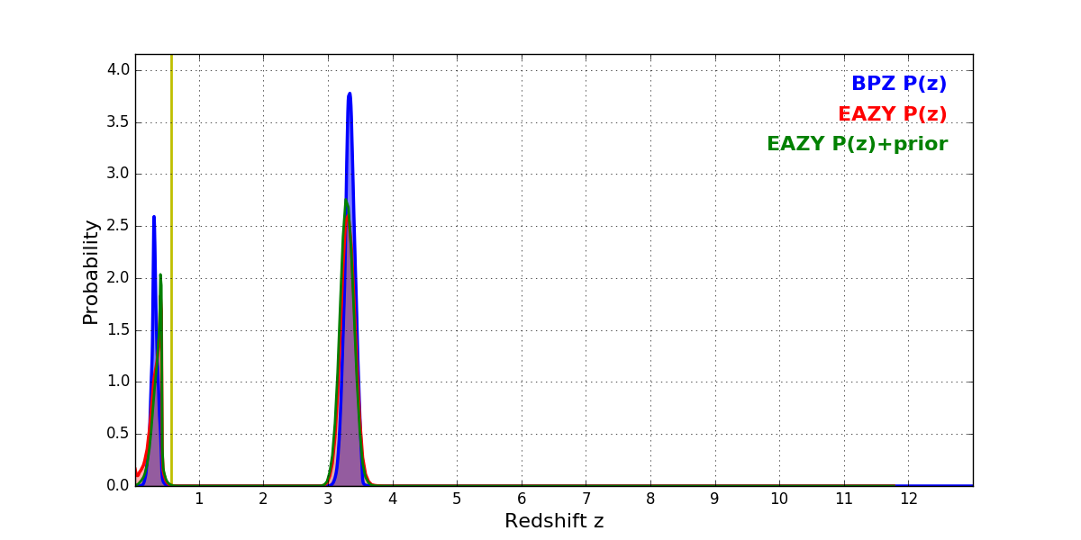 In P(z) plots: Yellow lines mark the cluster redshift z = 0.566,