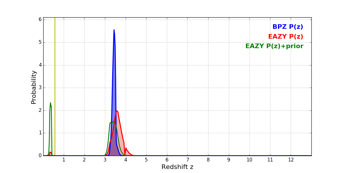 In P(z) plots: Yellow lines mark the cluster redshift z = 0.566,