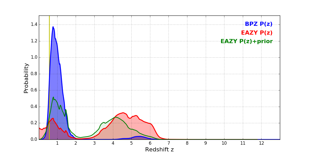 In P(z) plots: Yellow lines mark the cluster redshift z = 0.566,