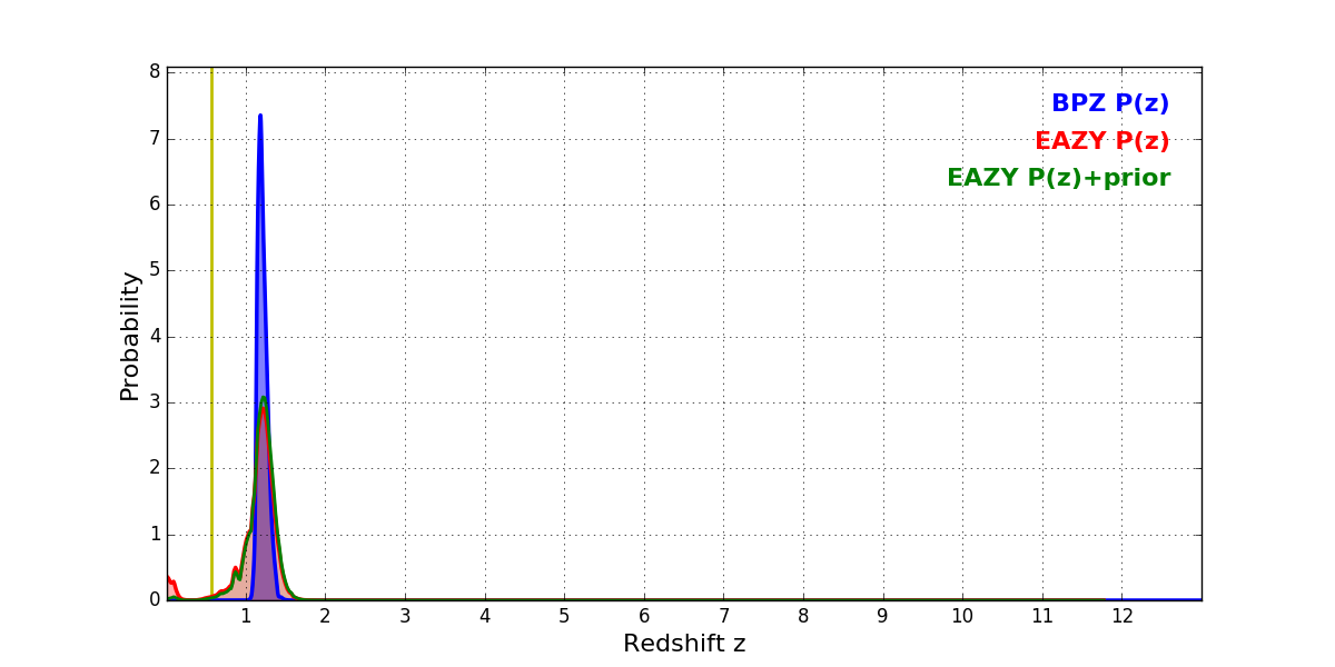 In P(z) plots: Yellow lines mark the cluster redshift z = 0.566,