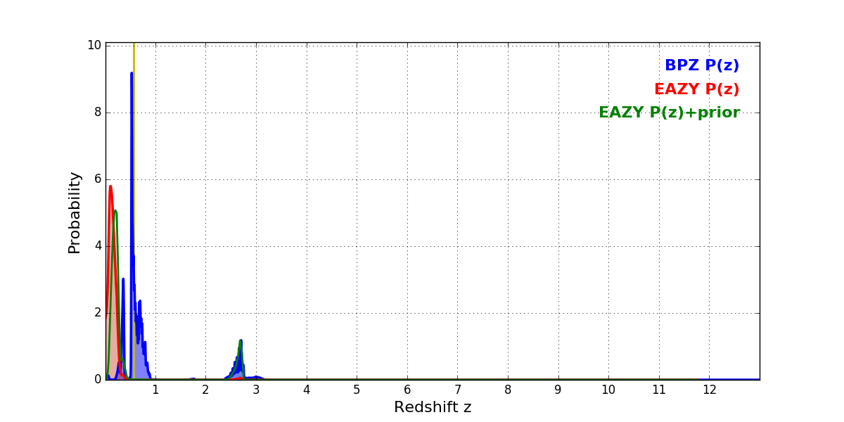 In P(z) plots: Yellow lines mark the cluster redshift z = 0.566,
