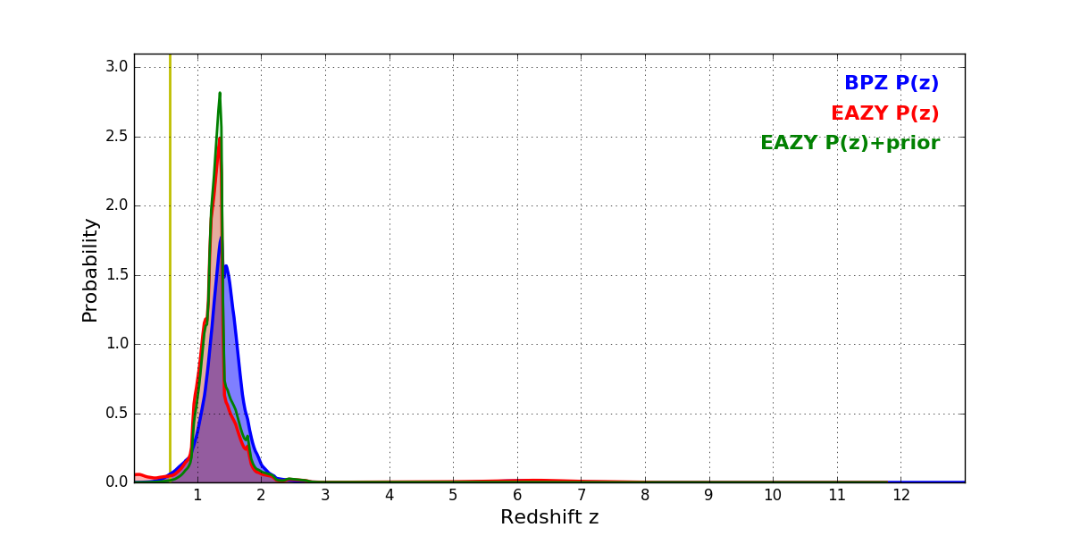 In P(z) plots: Yellow lines mark the cluster redshift z = 0.566,