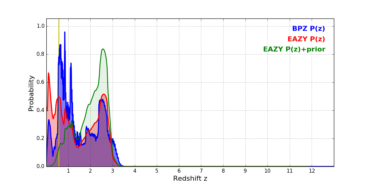 In P(z) plots: Yellow lines mark the cluster redshift z = 0.566,