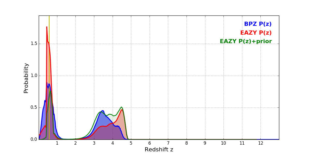 In P(z) plots: Yellow lines mark the cluster redshift z = 0.566,