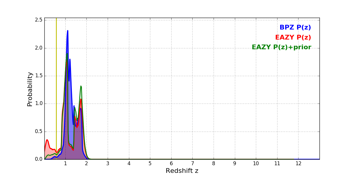 In P(z) plots: Yellow lines mark the cluster redshift z = 0.566,