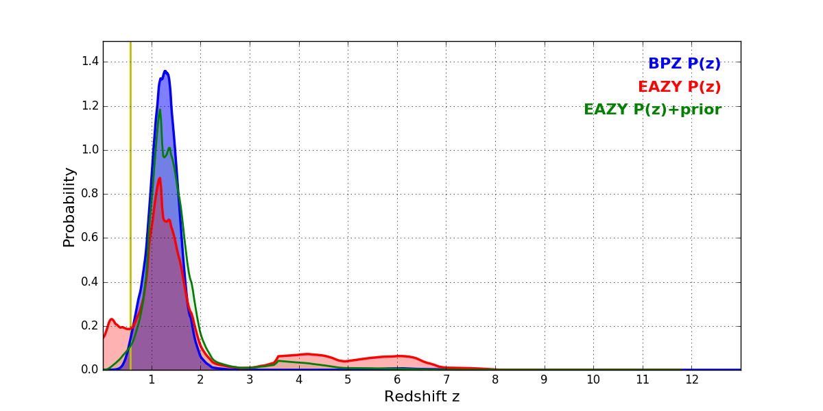 In P(z) plots: Yellow lines mark the cluster redshift z = 0.566,