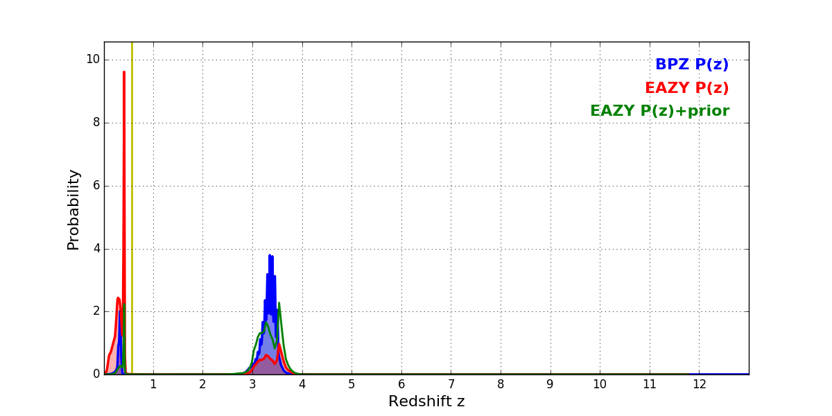 In P(z) plots: Yellow lines mark the cluster redshift z = 0.566,