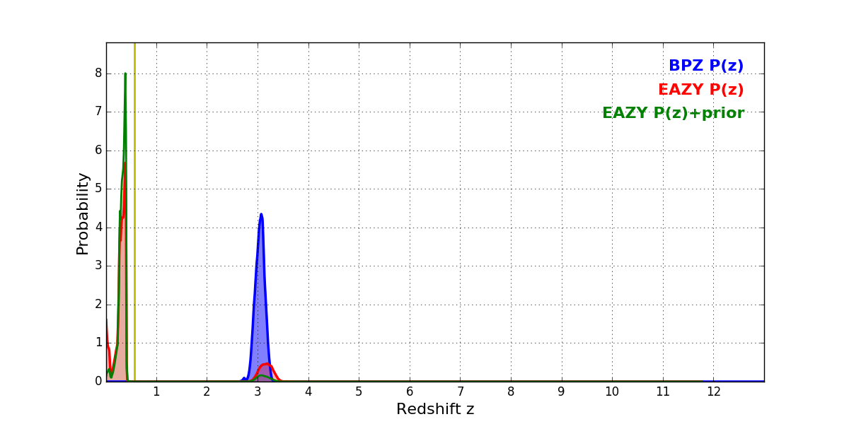 In P(z) plots: Yellow lines mark the cluster redshift z = 0.566,