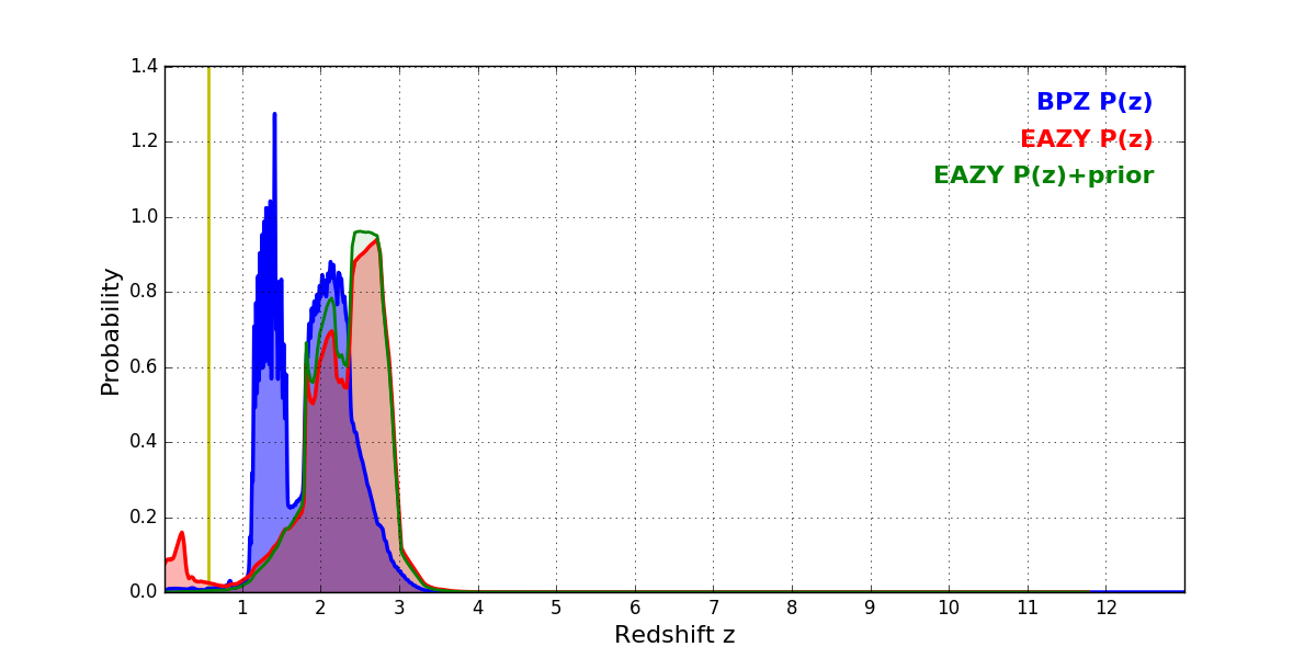 In P(z) plots: Yellow lines mark the cluster redshift z = 0.566,