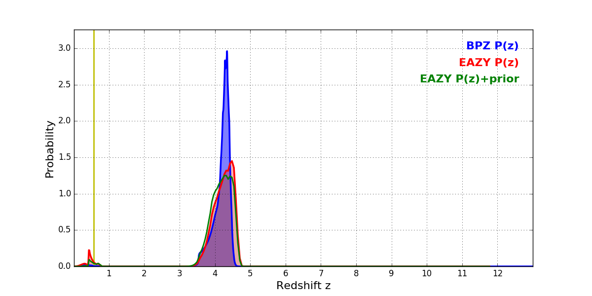 In P(z) plots: Yellow lines mark the cluster redshift z = 0.566,
