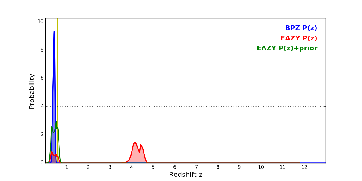 In P(z) plots: Yellow lines mark the cluster redshift z = 0.566,