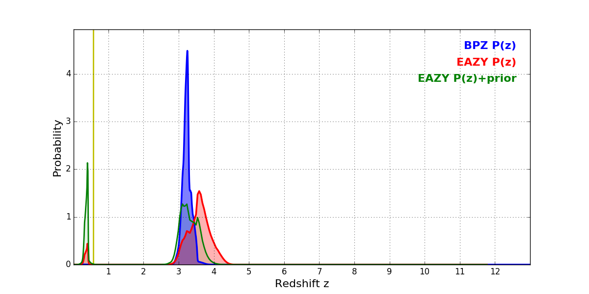 In P(z) plots: Yellow lines mark the cluster redshift z = 0.566,