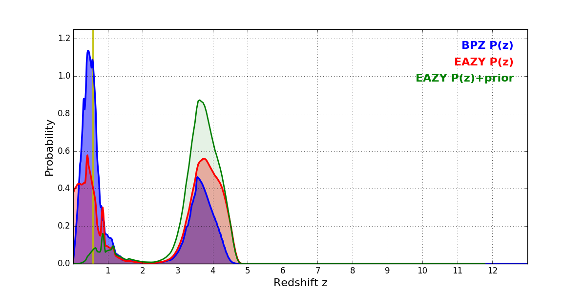 In P(z) plots: Yellow lines mark the cluster redshift z = 0.566,