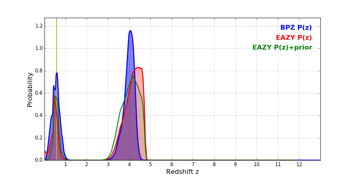 In P(z) plots: Yellow lines mark the cluster redshift z = 0.566,