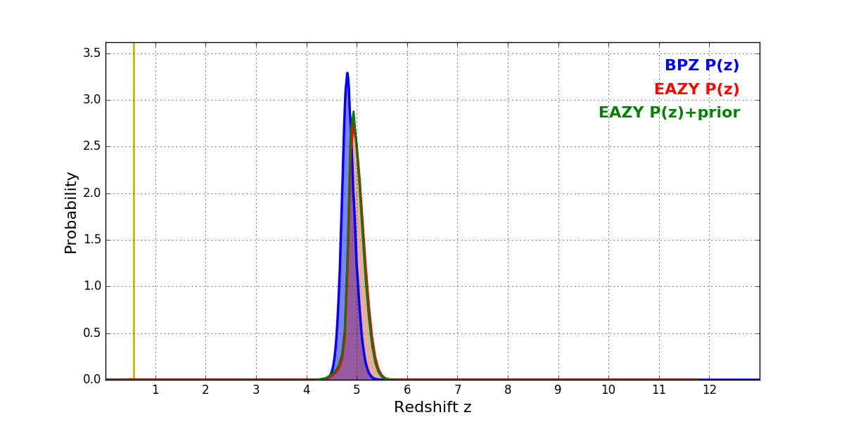In P(z) plots: Yellow lines mark the cluster redshift z = 0.566,