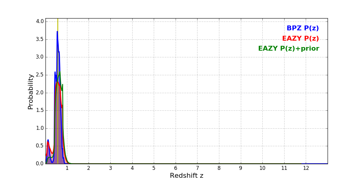 In P(z) plots: Yellow lines mark the cluster redshift z = 0.566,