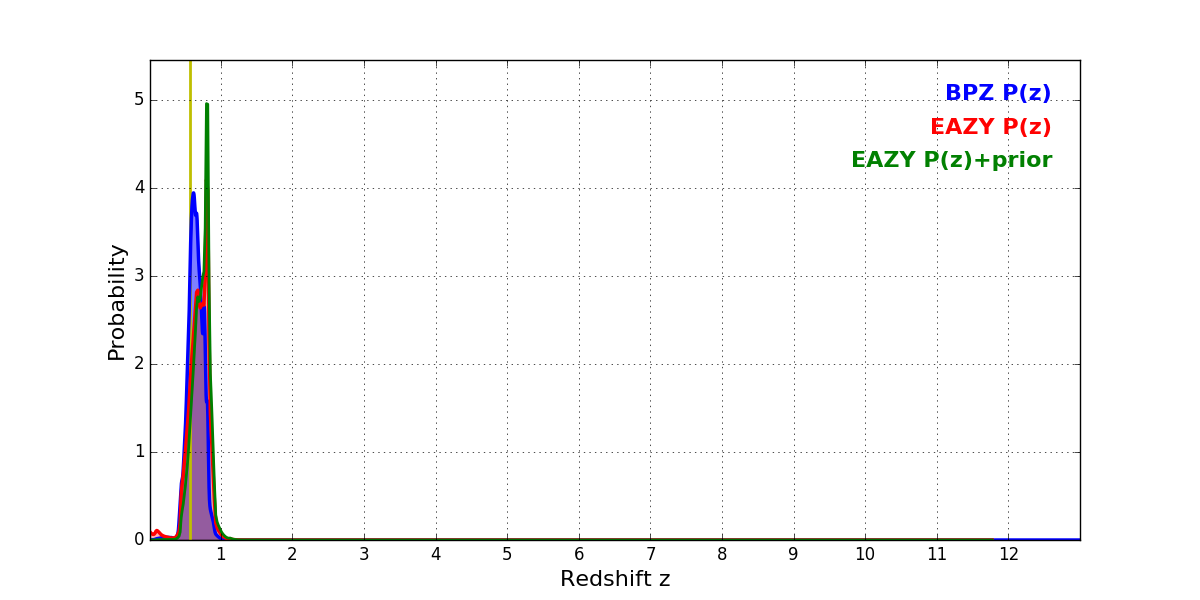 In P(z) plots: Yellow lines mark the cluster redshift z = 0.566,