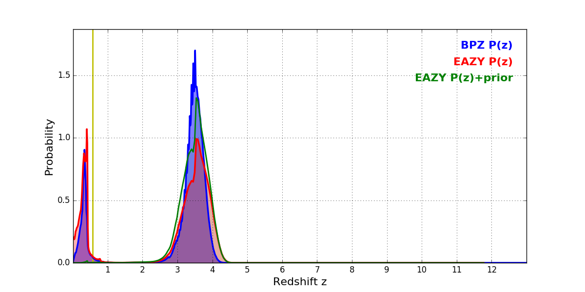 In P(z) plots: Yellow lines mark the cluster redshift z = 0.566,