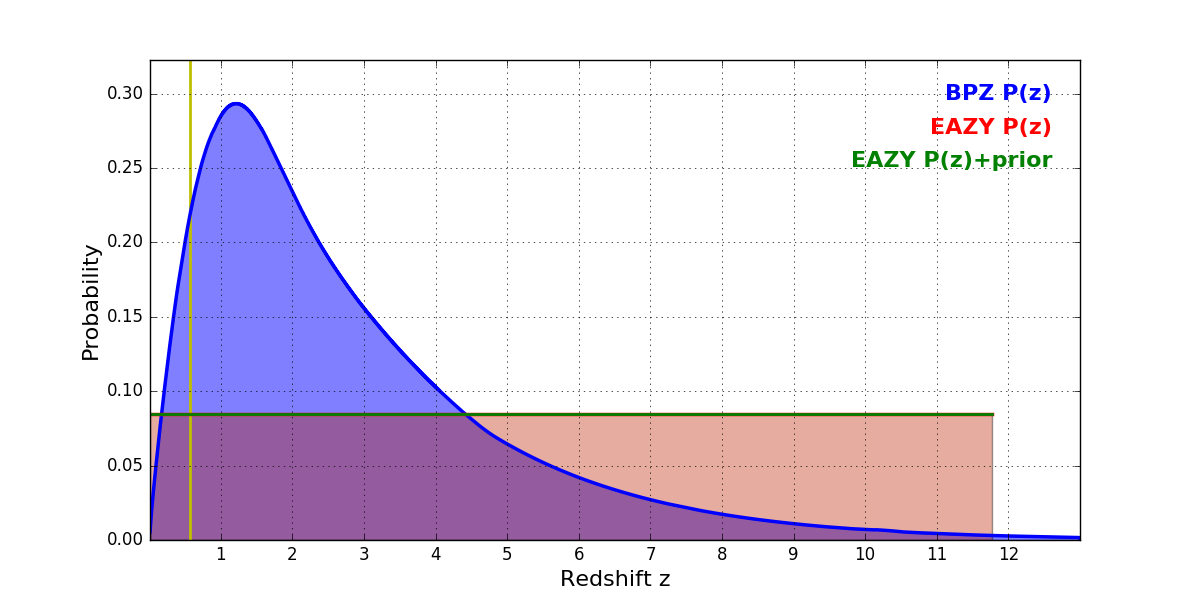 In P(z) plots: Yellow lines mark the cluster redshift z = 0.566,