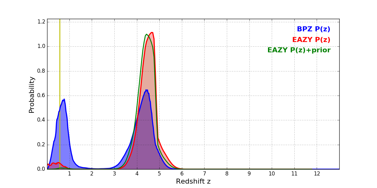 In P(z) plots: Yellow lines mark the cluster redshift z = 0.566,