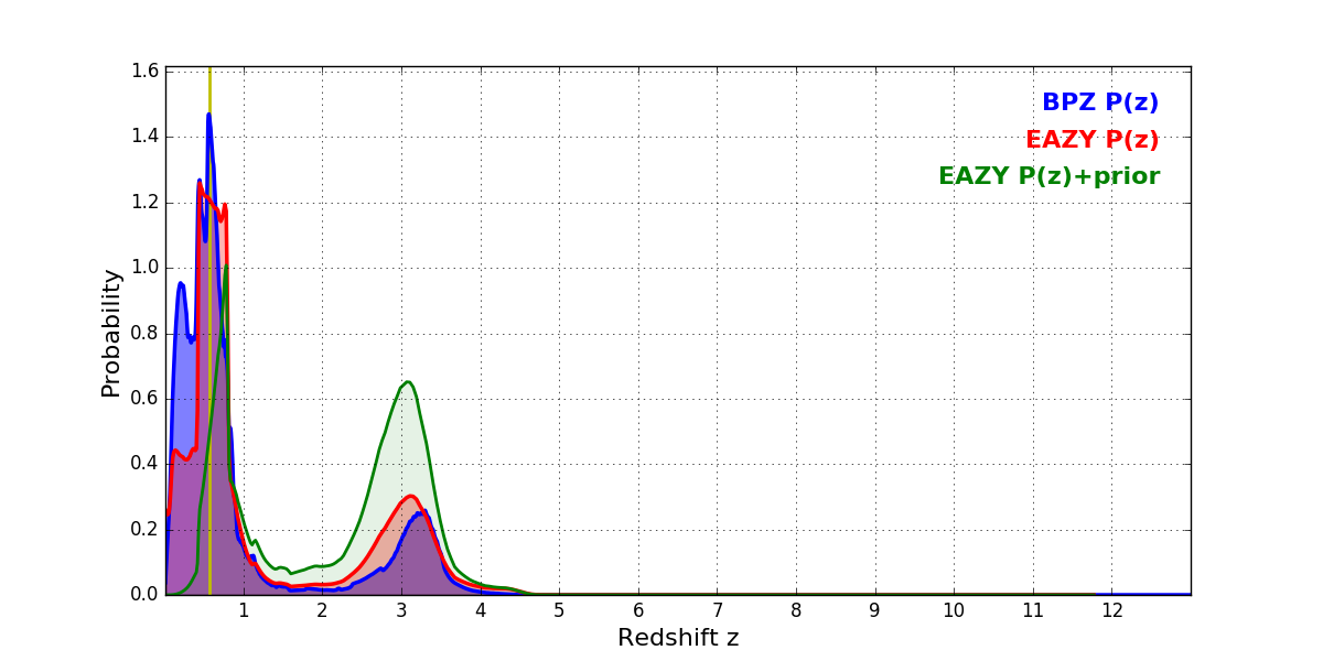 In P(z) plots: Yellow lines mark the cluster redshift z = 0.566,