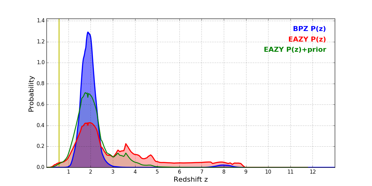 In P(z) plots: Yellow lines mark the cluster redshift z = 0.566,