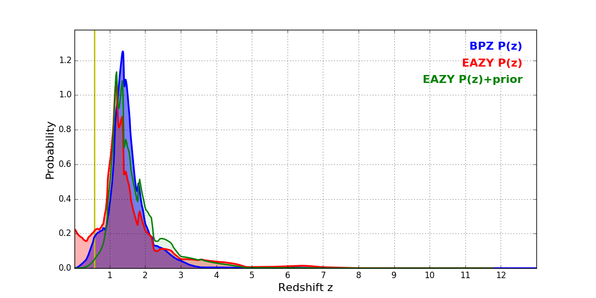 In P(z) plots: Yellow lines mark the cluster redshift z = 0.566,