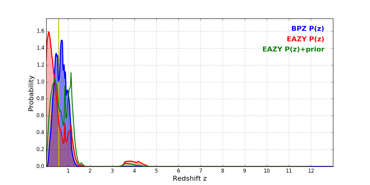 In P(z) plots: Yellow lines mark the cluster redshift z = 0.566,