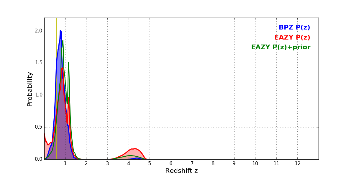 In P(z) plots: Yellow lines mark the cluster redshift z = 0.566,