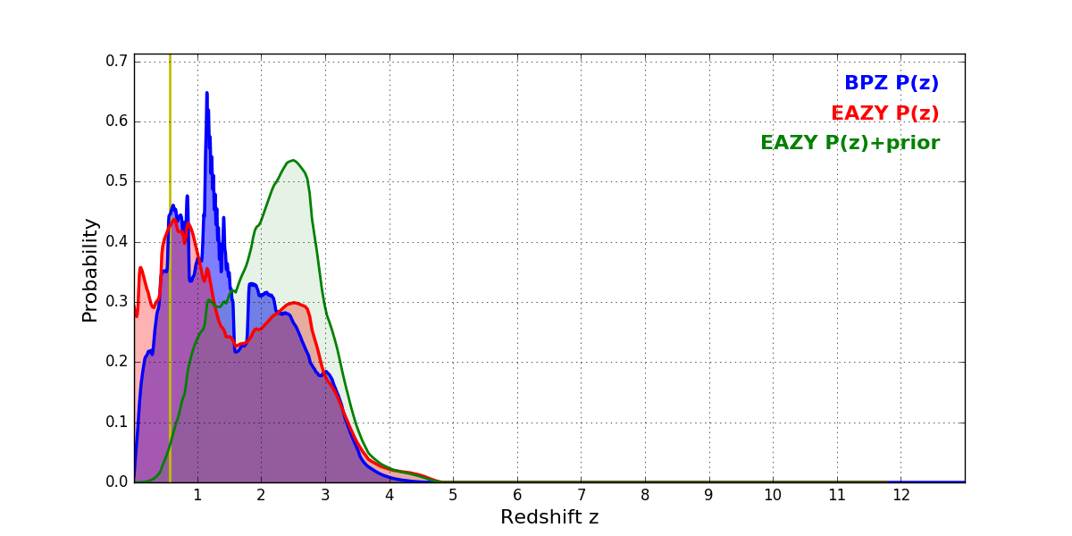 In P(z) plots: Yellow lines mark the cluster redshift z = 0.566,