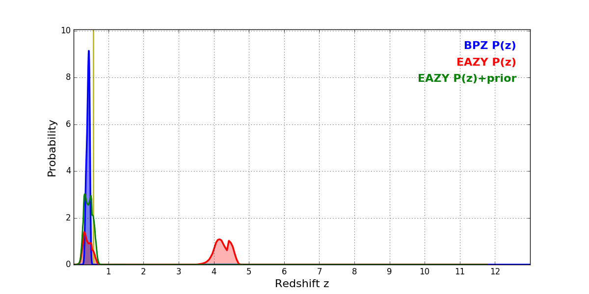 In P(z) plots: Yellow lines mark the cluster redshift z = 0.566,