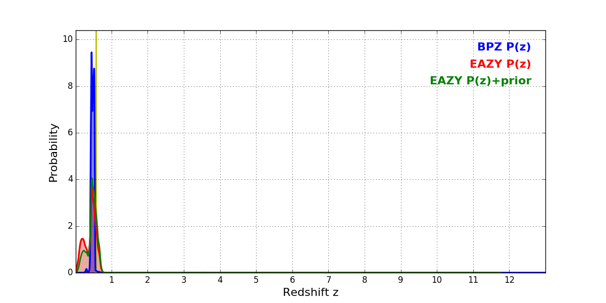 In P(z) plots: Yellow lines mark the cluster redshift z = 0.566,