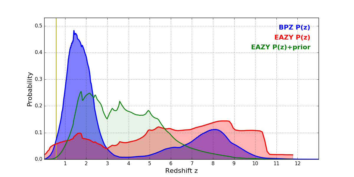 In P(z) plots: Yellow lines mark the cluster redshift z = 0.566,