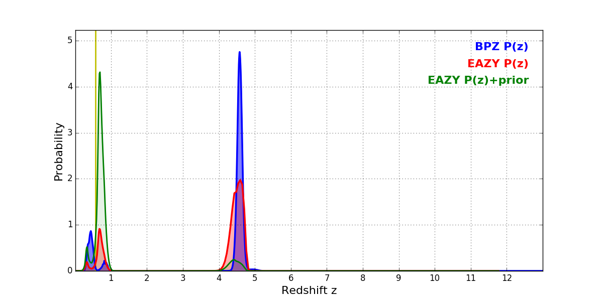 In P(z) plots: Yellow lines mark the cluster redshift z = 0.566,