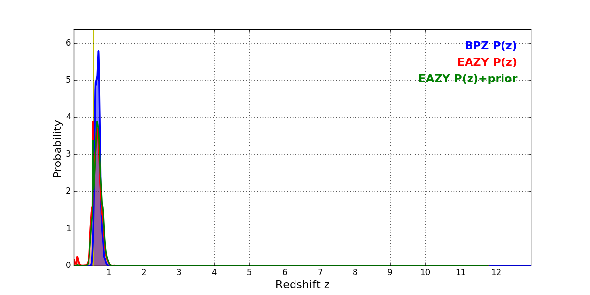 In P(z) plots: Yellow lines mark the cluster redshift z = 0.566,