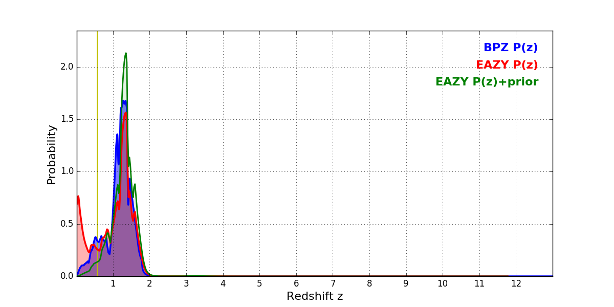 In P(z) plots: Yellow lines mark the cluster redshift z = 0.566,